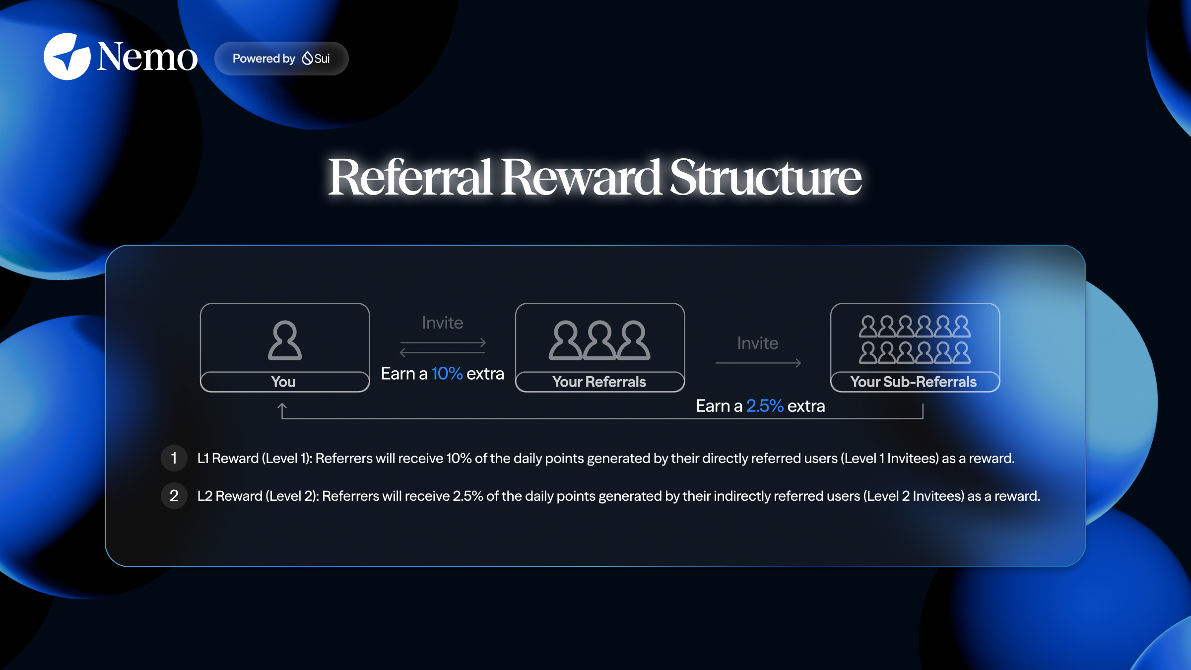 * L2 Reward (Level 2): Referrers will receive 2.5% of the daily points generated by their indirectly referred users (Level 2 Invitees) as a reward.