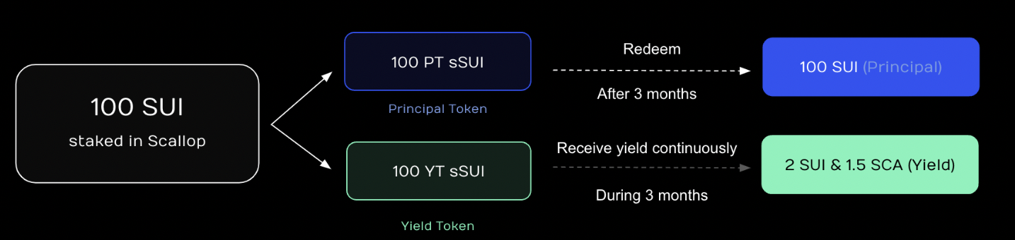 For example if you deposit 100 SUI into Scallop you may get 97 sSUI (more or less), and after 3 months, you could choose to redeem these sSUI to get back your **100 SUI** (principle) and **1.5 SUI & 2 SCA** (yield).