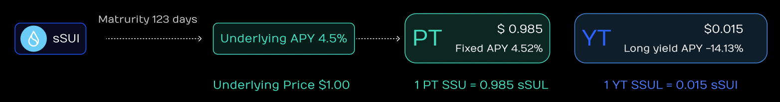 Then, Alice sensed the onset of a bear market (typically characterized by a decline in APY). Anticipating that the underlying APY would drop below 5% in the upcoming period, she decided to sell all her YT and purchase PT to secure the current 5.26% yield. Therefore, she bought 569.3 PT sSUI with all her $547.67.